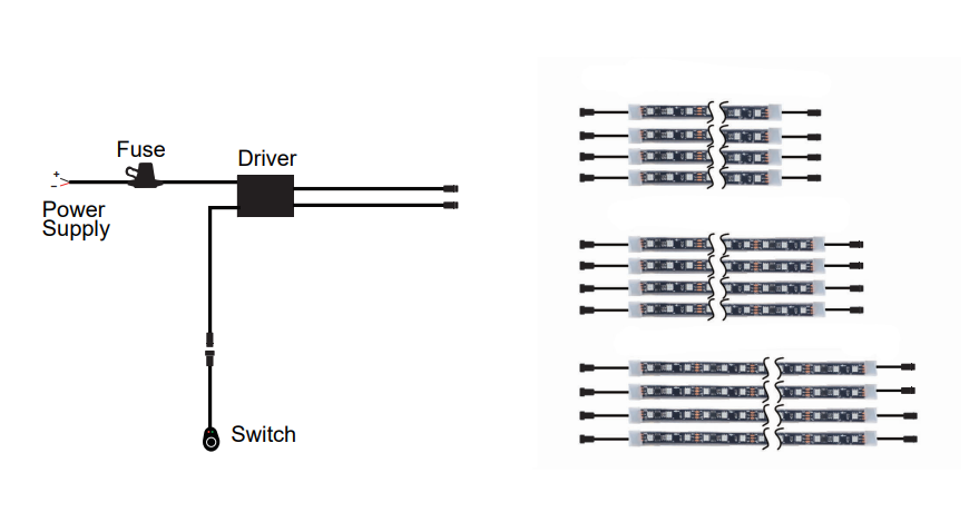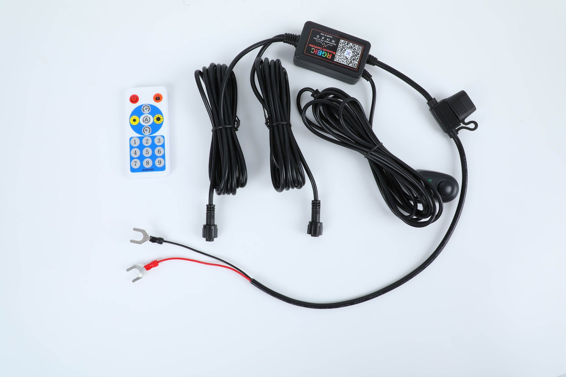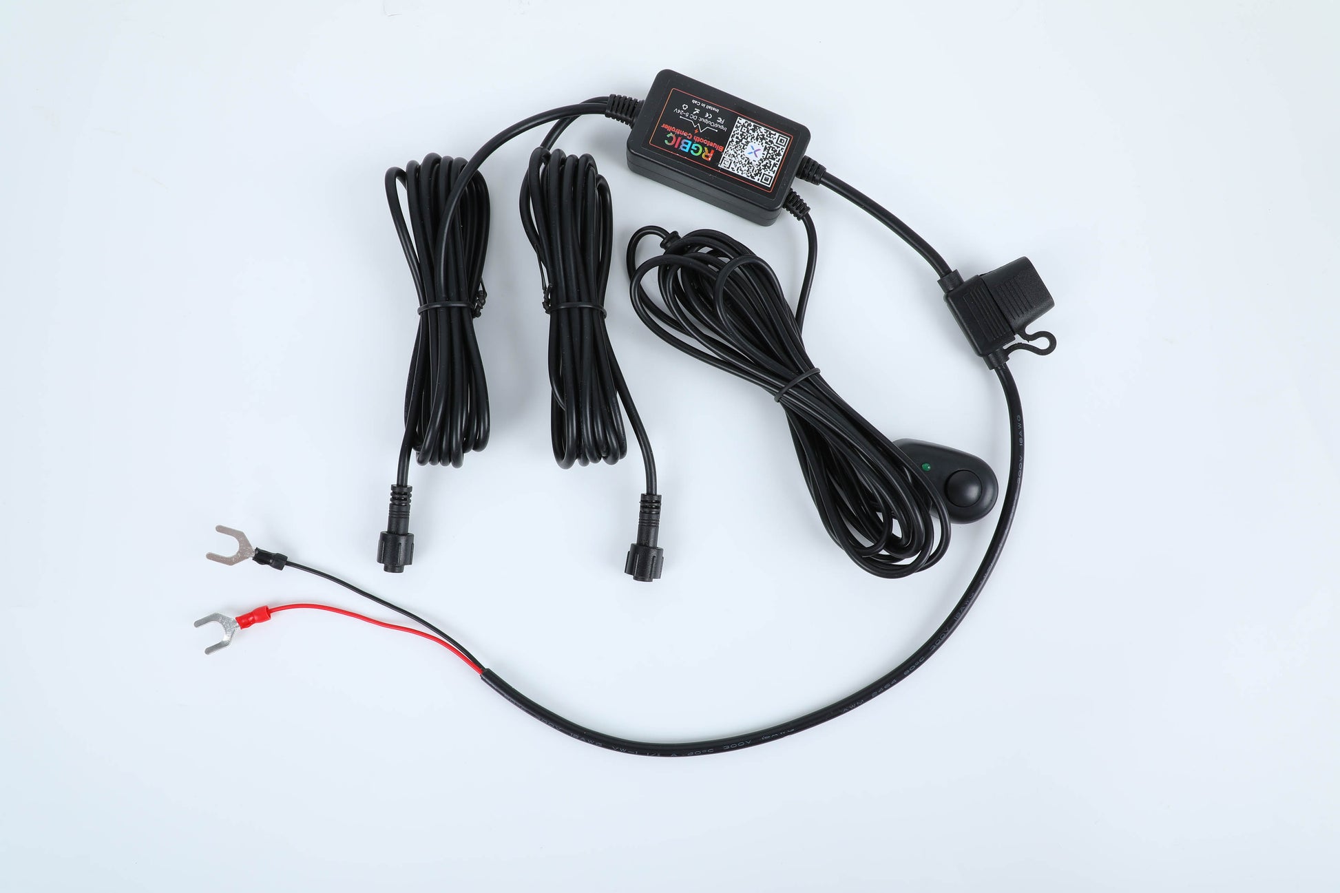 - Bluetooth Controller (200 color-chasing modes + unlimited solid colors) with integrated Relay, Fuse, Switch Wiring Harness